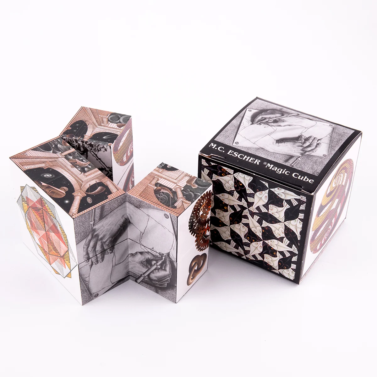 3D Magic Cube decorated with M.C. Escher-inspired tessellations. Solid construction with full-wrap printed design on all sides. Enhances logic and spatial skills. Ideal for puzzle enthusiasts, collectors, and unique art gift ideas.